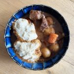 For the dumplings – whisk together the 3 dry ingredients, cut in the butter as you would with pastry, then stir in the milk. When the stew is ready, taste for seasonings (though I generously season the beef and usually don’t need to add anything), get it gently simmering on the stove and drop the dumpling mixture in good-sized spoonfuls evenly across the top of it all. Leave them to cook for about 15 minutes and then put the lid on and simmer for another 15 minutes or so. Check them, you can’t really overcook them, but underdone dumplings wreck everything.