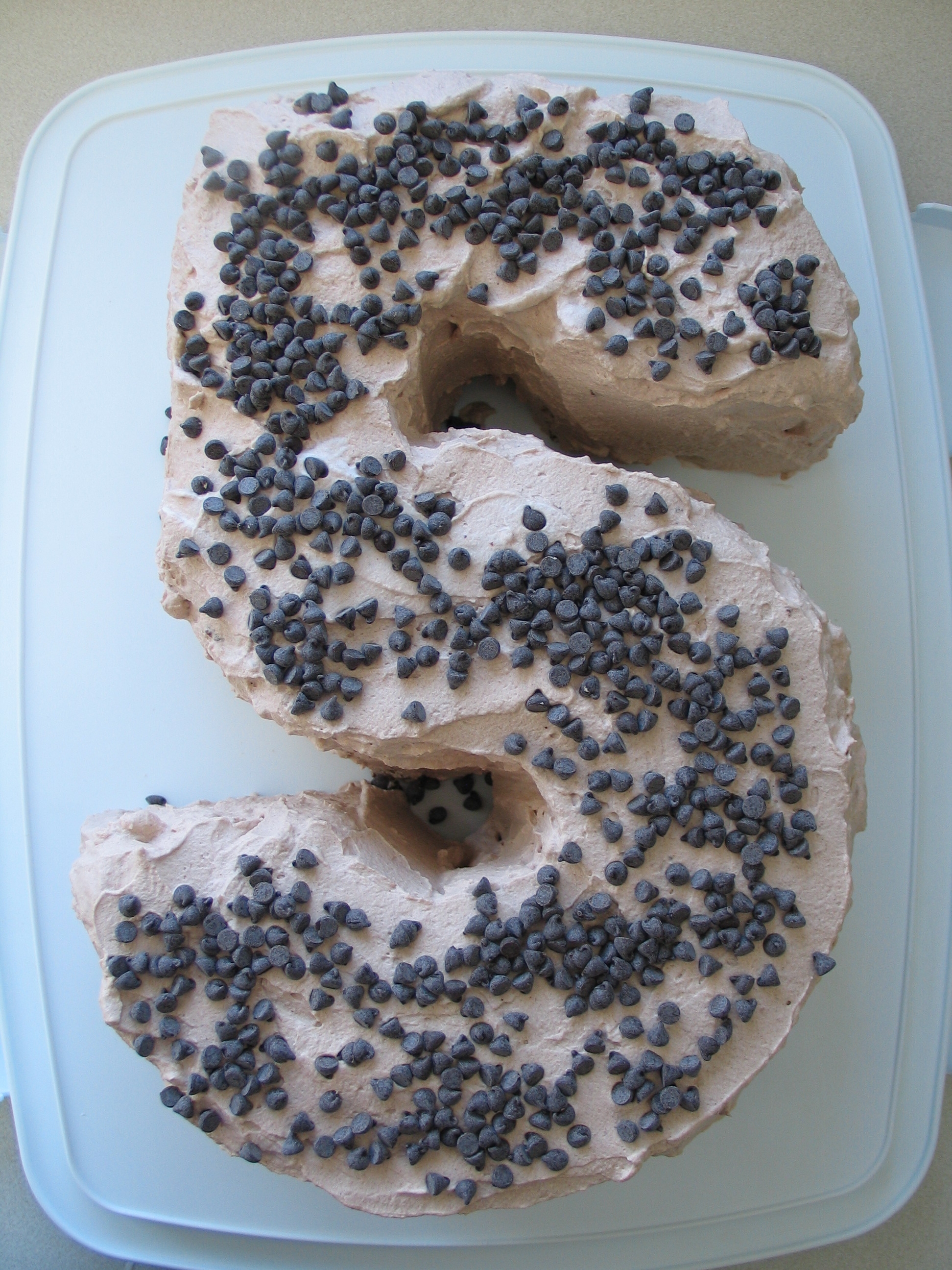 This is straight from Mom, I made a couple ahead of time (well, 3, just in case) wrapped them well and froze them and they came out beautifully. Brock fashioned them into a perfect ‘5’ for me and I used Mom’s idea of whipping cream with powdered Quik in it for a very easy icing, and then I topped it all off with mini chocolate chips. I see more number cakes in my future… **Updated for their 8th birthday! – March 8, 2014**