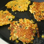 Transfer all to a large bowl and toss with the cornmeal, then add in the eggs and stir well. Wipe out the skillet and heat it up again with a bit of olive oil, then cook the fritters in batches making each one as big as you’d like (mine were about a half cup in size). Cook a few minutes per side and then transfer them to a plate when they’re done, the egg should serve to hold them together nicely. Serve sprinkled with goat cheese. Enjoy!