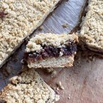 Firmly press half of the crust mix into the bottom of your prepared pan (use the bottom of a cup), spread the date mixture evenly over the top and then top with the rest of the crust, pressing only lightly this time (use your fingers). Bake for about 45 minutes until it’s just starting to brown all over (mind the edges!) and then leave the cake to cool completely before loosening it from the edges with a sharp knife, and attempting to lift it out of the pan using the parchment handles…and then cutting it into squares. This cake keeps very well in a sealed container on your counter, but also freezes beautifully – enjoy!