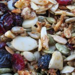This recipe started out as one from Mom but has since morphed considerably into the granola that Brock and the girls (and I) love. Obviously many different ingredients can be substituted, but this is the recipe that we enjoy the most. I always double it when I make it, mixing it in separate bowls and cooking it in 2, 9x 13 pans that I rotate each time I remove them to stir it. If I can’t find raw seeds, then I buy the roasted kind and add them at the end after the rest of the granola is cooked. Also, some of the recipe is written using grams as a guideline simply because those are the packages that I buy and then I don’t bother measuring – it’s just how I do it.
