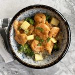 Remove the skillet from the heat, stir in the green onions and basil (and pineapple if using) and then spoon liberally over a big bowl of rice (or riced cauliflower). We had broccoli with it, but a prettier suggestion is sauteed snow peas (we also love roasted asparagus in bite-sized pieces).