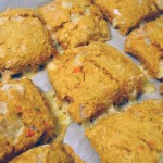 Preheat the oven to 400, cover a baking sheet with parchment and combine the first 6 ingredients in a large bowl. Add in the butter and use a pastry cutter to combine – once it’s worked in the mixture should be mealy in texture. In a separate bowl combine the buttermilk and yam, then add it all into the flour bowl – stir and then use your hands to gently knead it all together, adding a touch more buttermilk if you feel it’s too dry.
