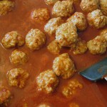Combine the 6 meatball ingredients in a large bowl and mix well – using your hands will be necessary. In a deep skillet or good-sized pot (I used my large, deep, non-stick skillet and all of the meatballs and sauce fit), whisk together the 5 sauce ingredients and bring the sauce to a simmer.