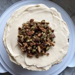 Place one layer of cake on your serving platter and carefully tuck 4 pieces of wax paper or parchment around the edges – these will be removed after you frost the cake, and they should catch all of the mess. Spread about 1/2 cup of frosting evenly over the cake, and then sprinkle on 1/2 to 1 cup of topping – make it even, or your cake will be lopsided. Gently place the second cake on top and give it a careful press so that it stays in place, then proceed to frost the top and sides with the rest of the frosting (though ‘naked’ sides are also lovely…and a bit easier) – use it all! Use the remaining topping to decorate as you wish – enjoy!