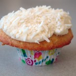 In a small bowl, whisk together the flour, baking powder, baking soda, and salt, and then add about 1/3 of this dry mix to the batter, alternating with half of the buttermilk, ending with the dry and mixing until just combined after the last addition. Fold in the coconut and scoop the batter into your prepared cups. The batter will be quite thick, if you make the cups as even as possible, they will bake up perfectly even without smoothing the tops. Bake for 25-30 minutes until the tops bounce back to a light touch and all are a lovely golden brown. Allow the cupcakes to cool in the pan for about 15 minutes, then remove them to a rack to cool completely before frosting.