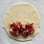 To assemble the pies, place a tablespoon or 2 of filling into the center of each chilled pastry round, fold it over and seal the edges carefully with a fork. No matter what you do, they will leak a bit of juice as they cook, but the filling will still hold a perfect consistency. Once all of the pies are assembled, put them back into the fridge for about 20 minutes and preheat your oven to 350.