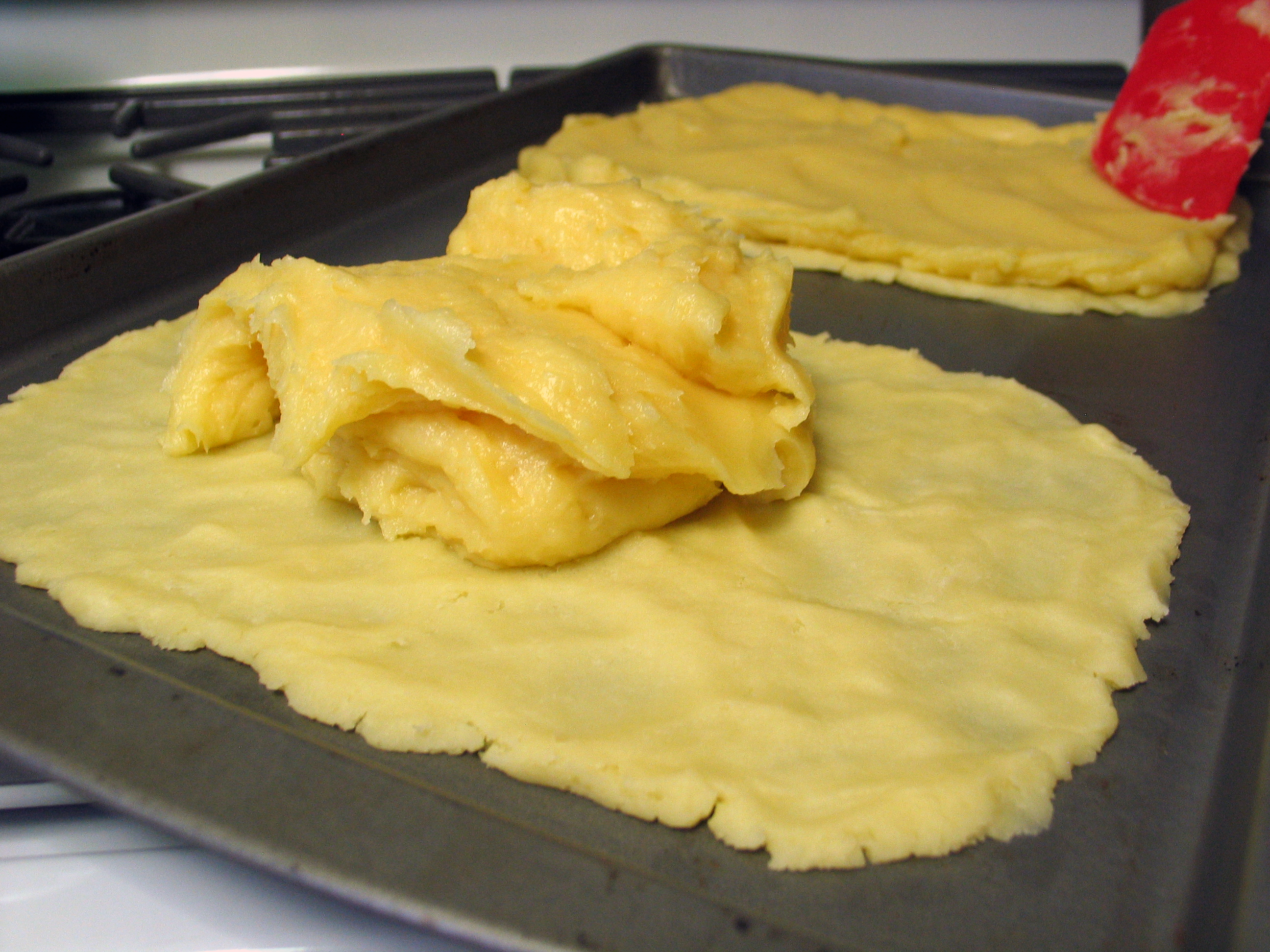 In a medium bowl, cut the butter into the flour with a pastry cutter then stir in the water and work it until you can roll it all into a ball and it sticks together. Cut the ball in half, and press each section of dough onto an ungreased baking sheet into 2, 12 x 3 inch rectangles or ovals. This will take some time – you want them a similar shape and an even thickness.