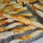 Preheat the oven to 375 and line a couple of baking sheets with parchment (I thought the twists would hold better if I ‘stuck’ each end to a bare pan…not the best idea). Brush the surface of a sheet of pastry with a bit of egg white, sprinkle with paprika and cayenne if using and then cover all with a good half cup of grated cheese. Use a rolling pin to gently push the cheese into the pastry.