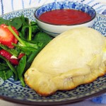 When the rolls have thawed and risen, roll them out on a lightly floured surface until then are roundish in shape and paper thin – mine weren’t beautiful, but they were tasty – that counts! Spoon 3-4 tablespoons of filling onto one half of the circle, fold the dough over and then press the edges with a fork to seal them up. Place each prepped calzone onto a parchment lined baking sheet, and when you have a pan ready to go, brush the tops with a bit of egg and bake for 14 to 20 minutes, depending on the size of each calzone. Serve with dipping sauce (and a salad), for any meal or snack.