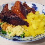 Day of serving – scrape off all of the fat and discard, and spoon the pork – and now probably jellied juice – into a proper sized pot and heat gently until hot all the way through. Even though I had reduced the liquid, ours was still quite thin and we didn’t mind one bit. We enjoyed our pork over couscous and green onion and with some of the pineapple compote listed below.