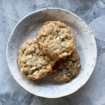 Preheat the oven to 350 and line a couple of baking sheets with parchment. Scrape the browned butter into your mixer bowl, add both sugars and beat until the mix is fluffy. Add the egg and beat again, then the vanilla, scraping down the sides of the bowl as needed. In a separate bowl, whisk together the flour, baking soda and salt and then pour half of the flour mix into the butter mix and mix until combined. Add the remainder of the flour, mix well, then add in the coconut chips in 2 parts as well.