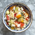 Assemble the vegetables and orzo in a large bowl and toss in the dressing – add in the goat cheese (or feta) and some and fresh herbs (like basil) if you’d like – chopped green onion is another suggestion. Let it all cool to room temperature and then serve.