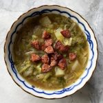 In a large soup pot, cook the bacon (or sausage) for several minutes until it’s nice and crisp and then add in the leeks and sage (though I now usually remove the bacon or sausage to use as garnish but cook the leeks in the fat). Cook and stir for a good 5 minutes until the leeks start to soften, then add in the potato and stir to coat for a couple of minutes. When all of the vegetables are sizzling, add in the broth, bring the pot to a boil and simmer for about 15 minutes until the potatoes have softened – add more broth if you need/want to. Add freshly ground pepper to taste (I can’t imagine you’d need salt!), and then stir in the cream (if using), right before you dish up – enjoy!